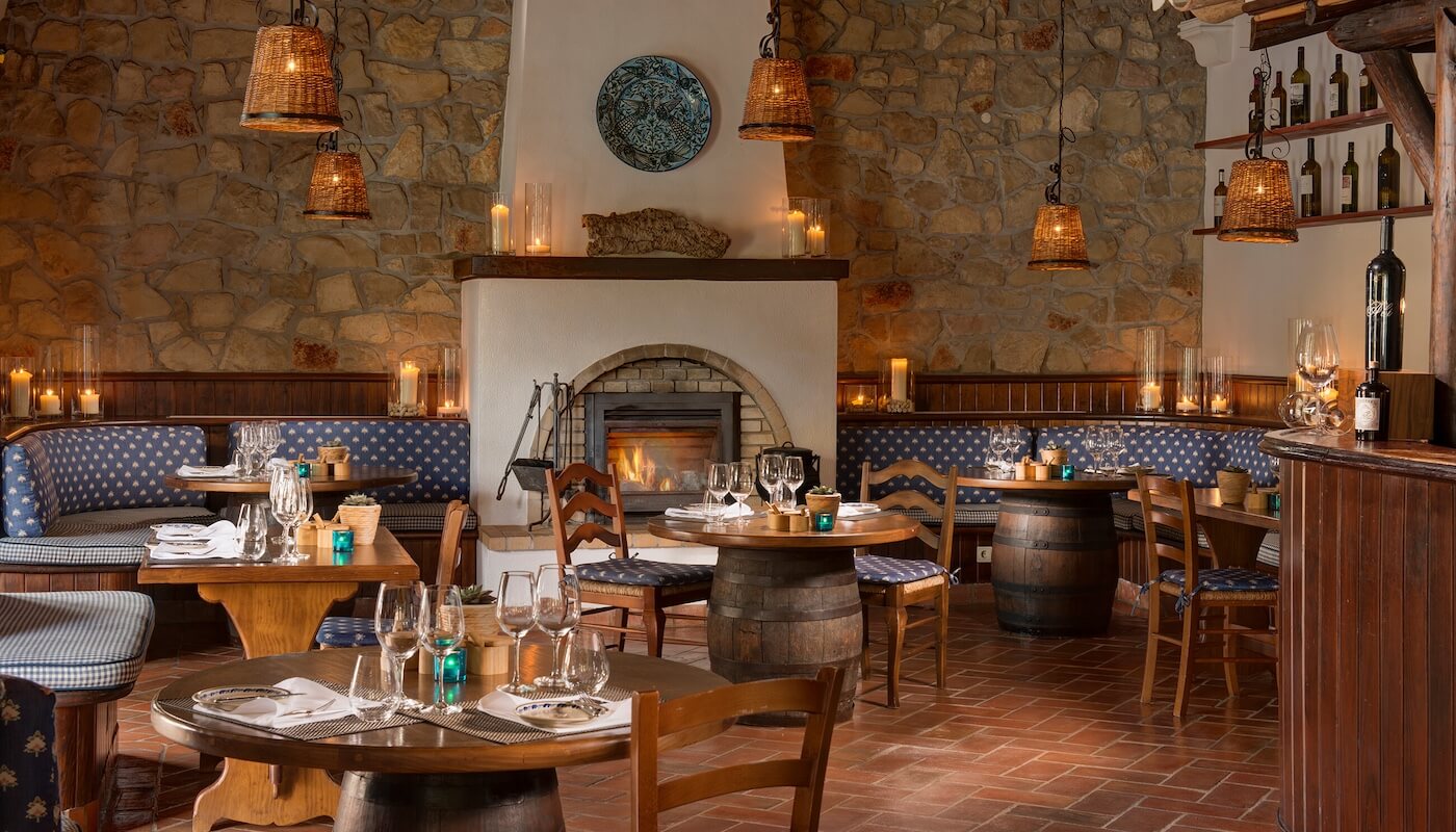 Step inside and the mood shifts to rustic elegance. The dining room feels like an old-world quinta brought lovingly into the present: exposed stone walls, reed ceilings, antique Portuguese household pieces, and handcrafted Porches pottery decorating the space. Wine barrels serve as table bases, paired with carved wooden tables and ladder-back chairs. A fireplace flickers in cooler months, adding to the cozy charm. It’s intimate, authentic, and unmistakably Portuguese.