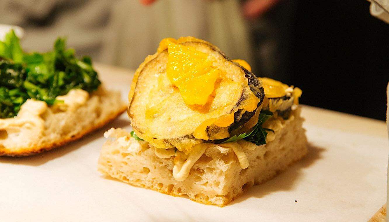 But the vegetables also impress. The menu is divided into sandwiches, soups, “not sandwiches,” and dessert. In the first category are roasted cauliflower on slow-fermentation focaccia, and eggplant tempura on the same.