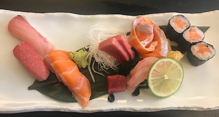 There’s a popular 10€ executive lunch menu that comprises a sushi or sashimi amuse bouche, miso soup, salad, rice, and a dish of the day. On the day we visited, the daily special was a grilled sardine, but, this being late June, we were sardined-out and opted instead for simple sushi and sashimi.
