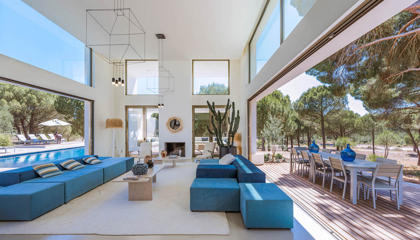Privacy is a key element in this outstanding Comporta home for luxury rentals. A glass passage leads to the bedrooms, all located on the ground floor with en-suite bathrooms, each opening up to its own private decked terraces.