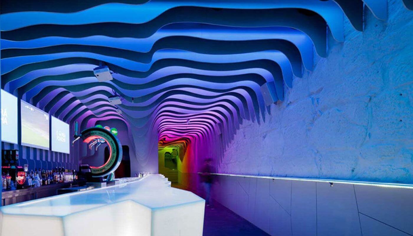 With the bar space being very narrow, co-owner Duarte Pestana sought the talents of local architect António Fernandez to create a “fluorescent cave”. Using lacquered MDF (medium-density fiberboard), Fernandez created the appearance of stalactites hanging from the roof of the cave. The undulating design produces an ultra-cool multidimensional effect. Ingenious RGB LED lighting between each panel emanates tones of red, green blue and yellow, changing the ambiance moment by moment.