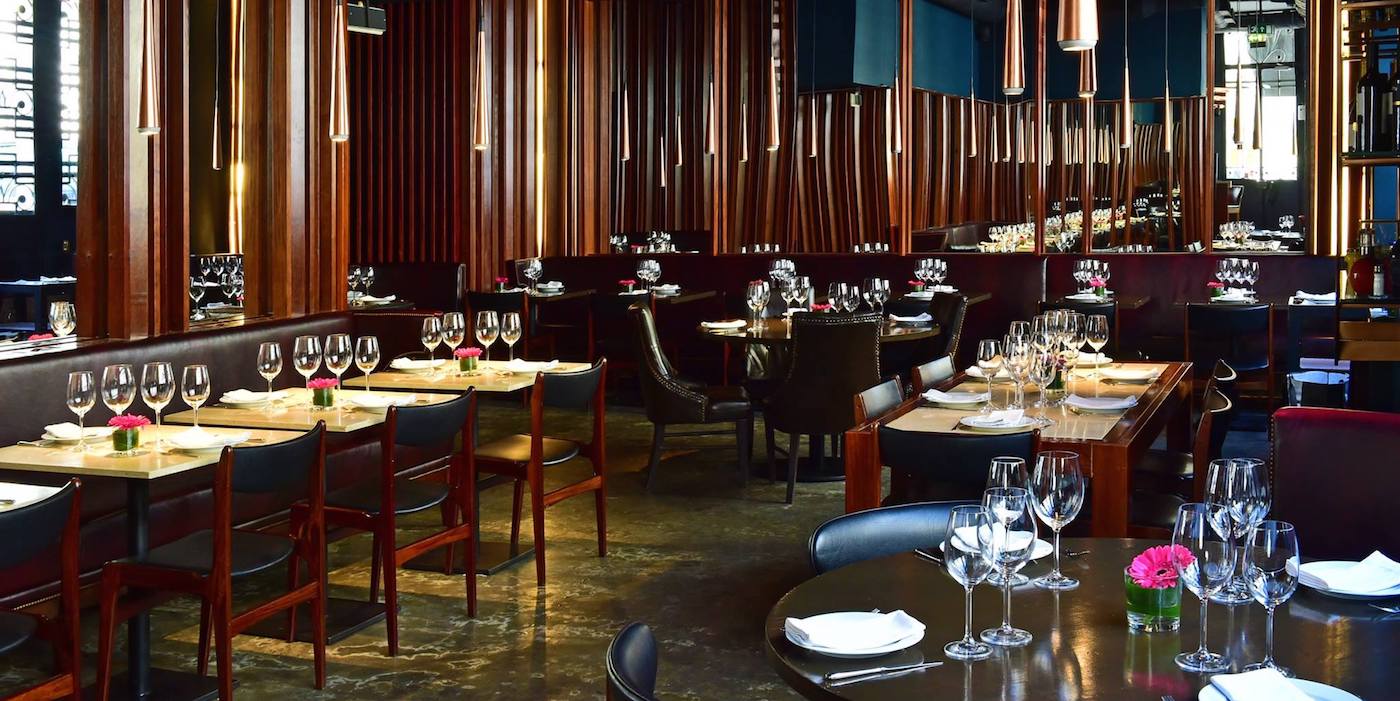Working with designer Ewa Kubik, Oliver’s use of heavy use of wood is a natural complement to the menu. Details of copper stand out against the teal background of the walls. Raspberry-toned couches add to the rich texture of the room.