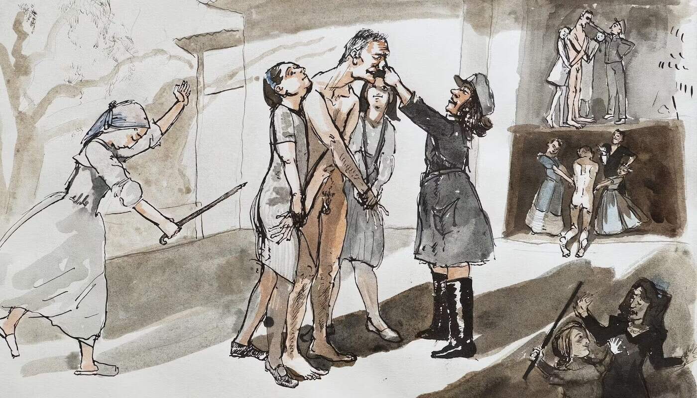 (at top) Paula Rego, Mocidade Portuguesa, 2005 | Chinese ink on paper, 29.7 x 42 cm, private collection | Photo credit: Nick Willing