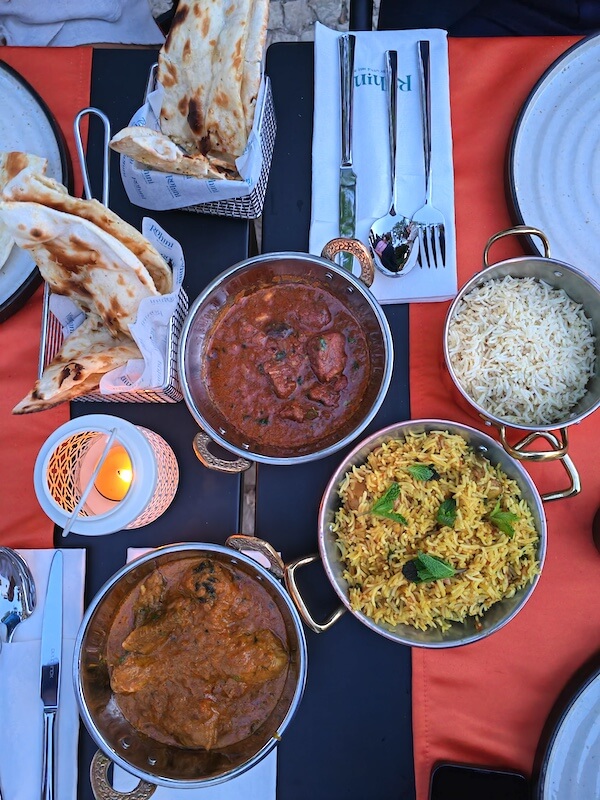 Accompany the dinner with a selection of Biriyani rice dishes (mutton, shrimp, chicken or vegetables), Naan (plain, cheese and chili, Kashmiri, garlic or butter) and Roti (plain, butter and missi), as well as a selection of basmati rices, and kulcha and lachha paratha breads.