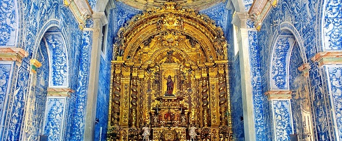 The Church of São Lourenço (St. Lawrence) in Almancil is considered one of the greatest artistic treasures in the Algarve. Built in the first half of the 18th century, it is a single nave church with a chancel covered by a beautiful dome. Extraordinary examples of Portuguese azulejos (traditional blue and white tiles) cover the walls and ceilings. Eight panels of tiles, designed by Policarpo de Oliveira Bernardes, describe various phases of the life of São Lourenço. The gilded Baroque altarpiece, with the image of the saint is believed to be crafted by the Algarve’s greatest sculptor and carver Manuel Martinez.