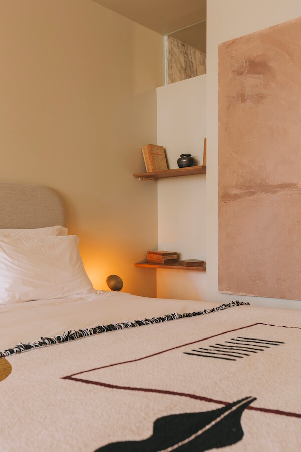 Inside, the interiors reflect a calm, design-led aesthetic inspired by Japandi minimalism. Soft neutral tones, natural wood, linen, rope, and rattan create warm, tactile spaces that feel immediately livable. Much of the furniture was custom designed and produced in Portugal, emphasizing clean lines and understated elegance. Local artwork and handcrafted details reinforce the sense of place, while generous natural light enhances the tranquil atmosphere.